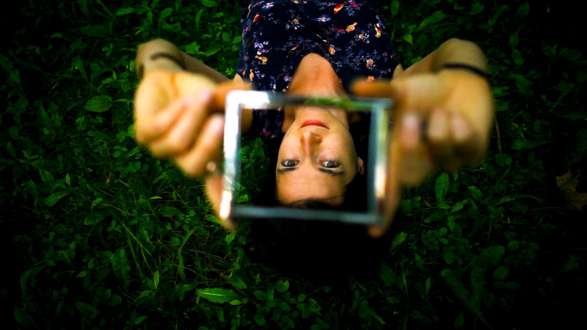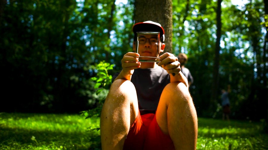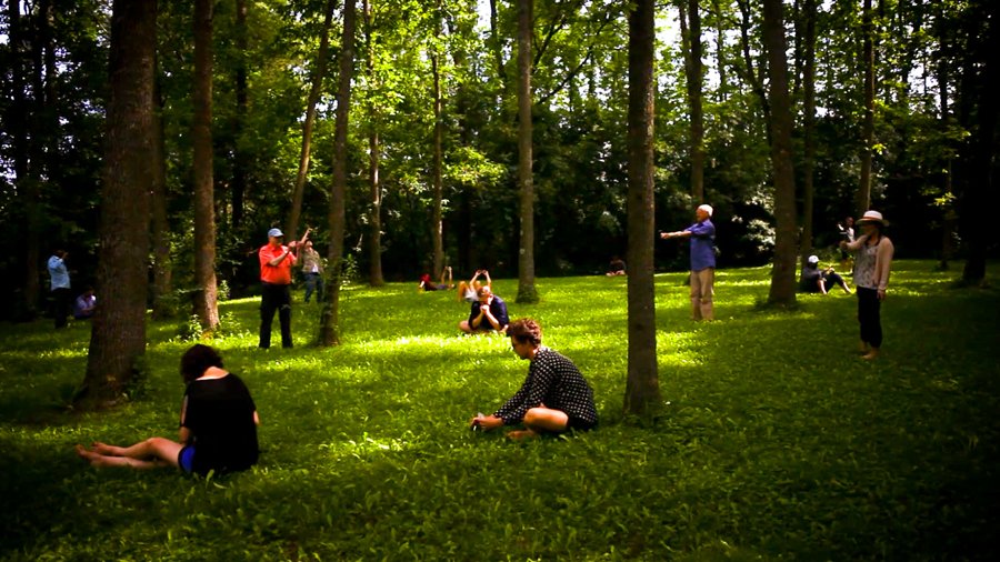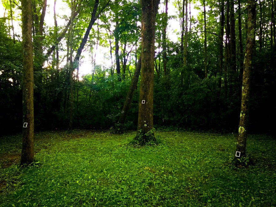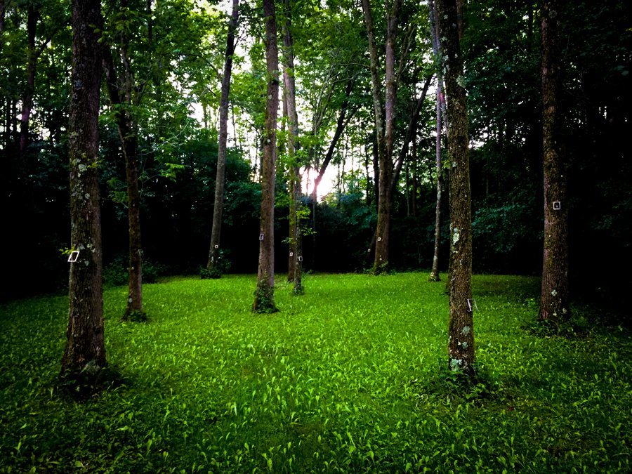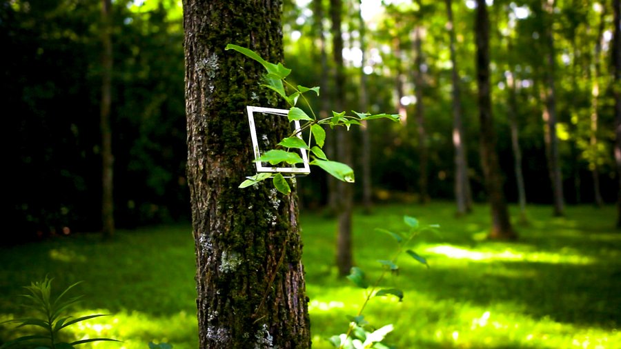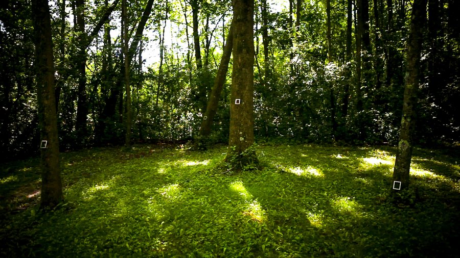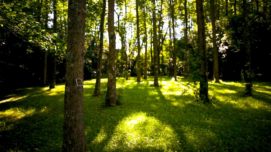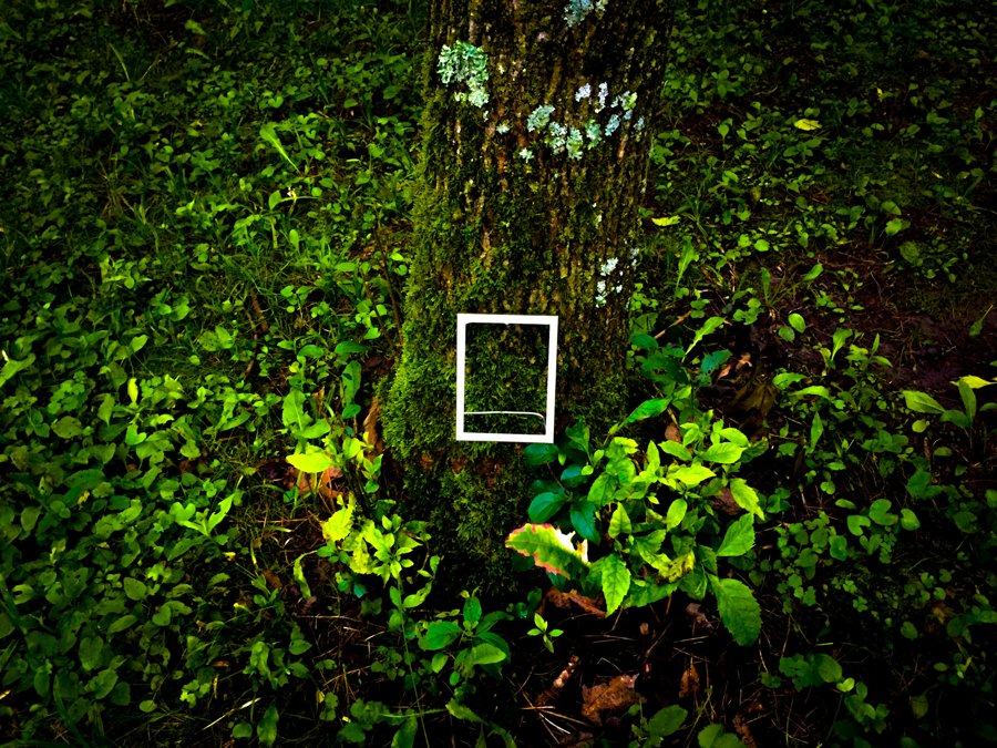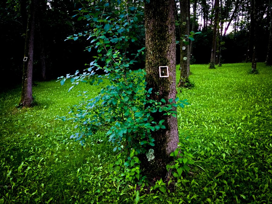 Through the shining silver rectangles of these empty picture frames, we examine the trees, the brook, the ground, and one another.