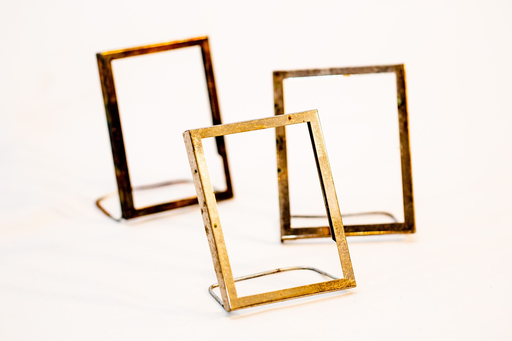 I gather a collection of my mother’s silver picture frames, after removing their glass and their backings. Using fencing wire, I make a small stand for each frame.
