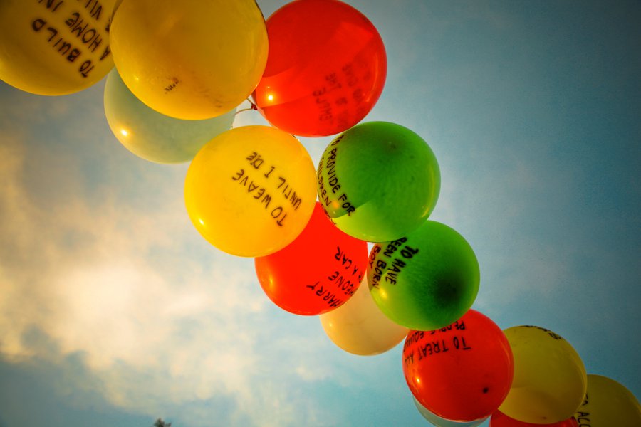 I asked people five questions pertaining to happiness: what makes them happy, what is their happiest memory, what is their favorite joke, what is their level of happiness between 1 and 10, and, if they could make one wish, what would it be. Based on each person's stated level of happiness, I inflated that number of balloons, so very happy people would be given 10 balloons and very sad people would be given only one (but hey, it's still a balloon). Then I wrote each person's wish onto a balloon of their favorite color. I repeated this process for 117 different people, from all different ages and backgrounds.