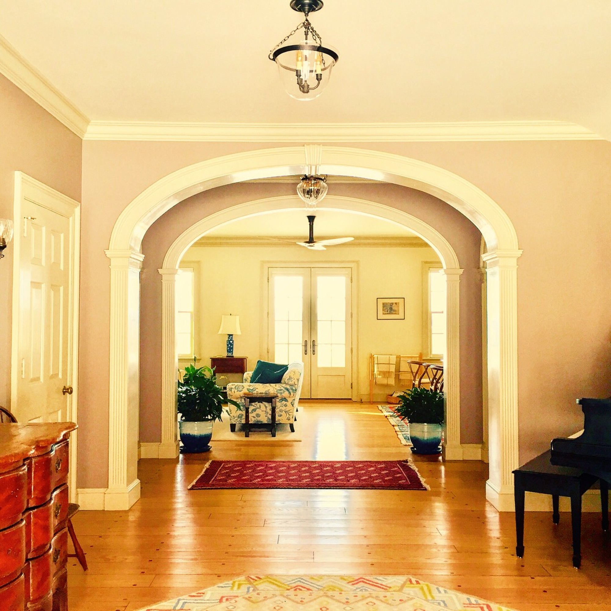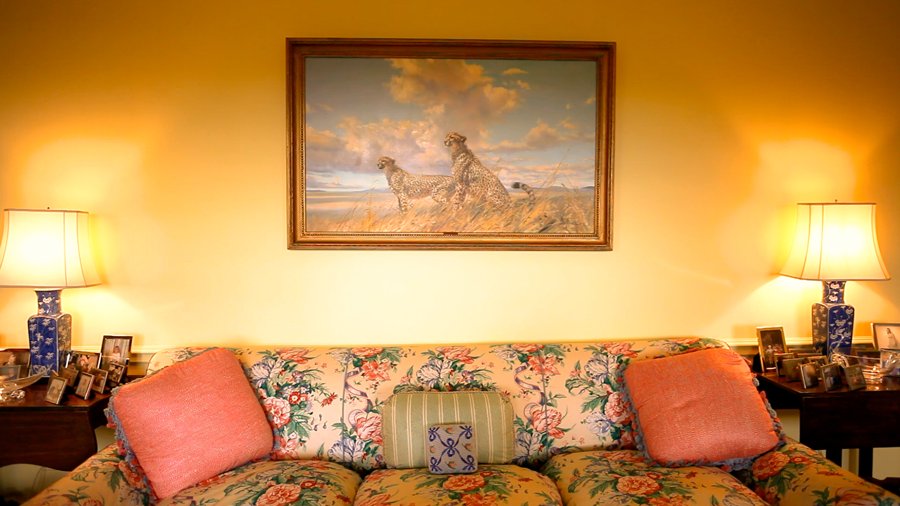 In the renovation of the Main House that followed in 2017, the wall where the cheetah painting once hung was demolished — replaced by an archway with a view from the front door of the house straight through to the lake in the “distance”.