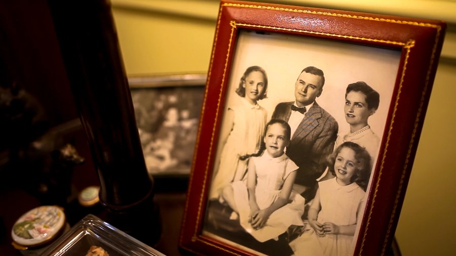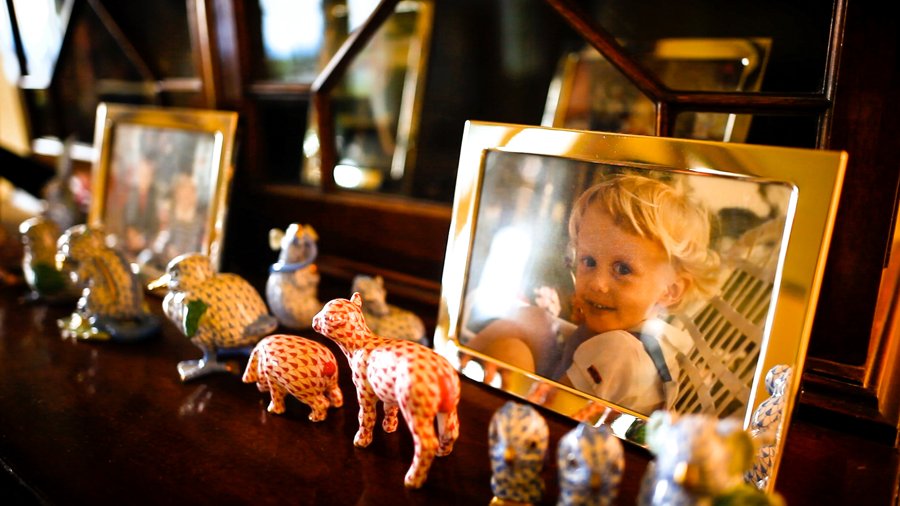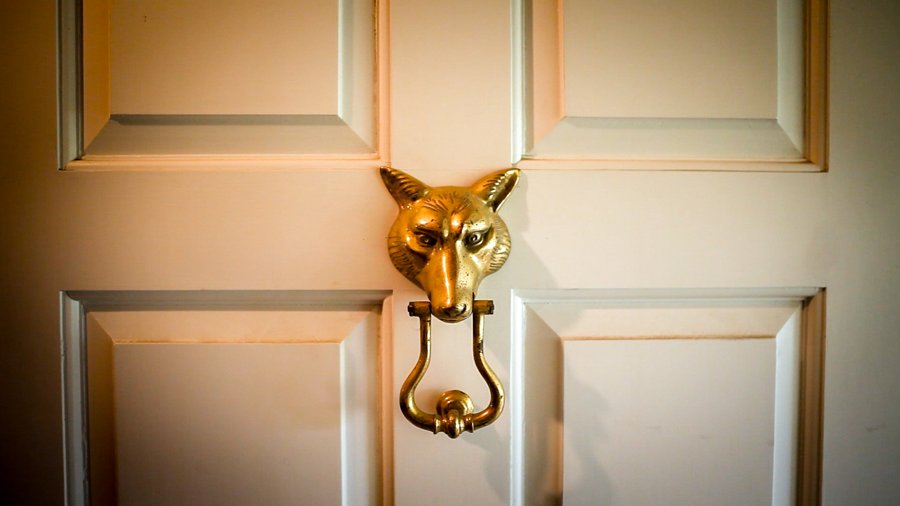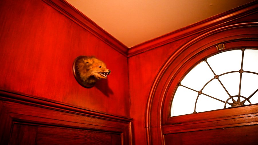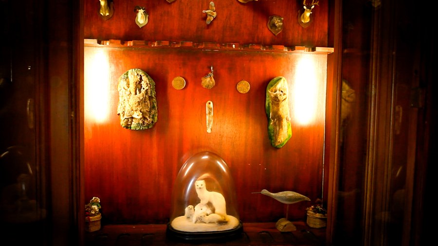Bits of the past are surveyed: a fox-head trophy, a ceramic owl, a taxidermied family of snow weasels, a brass door knocker, a collection of silver frames.