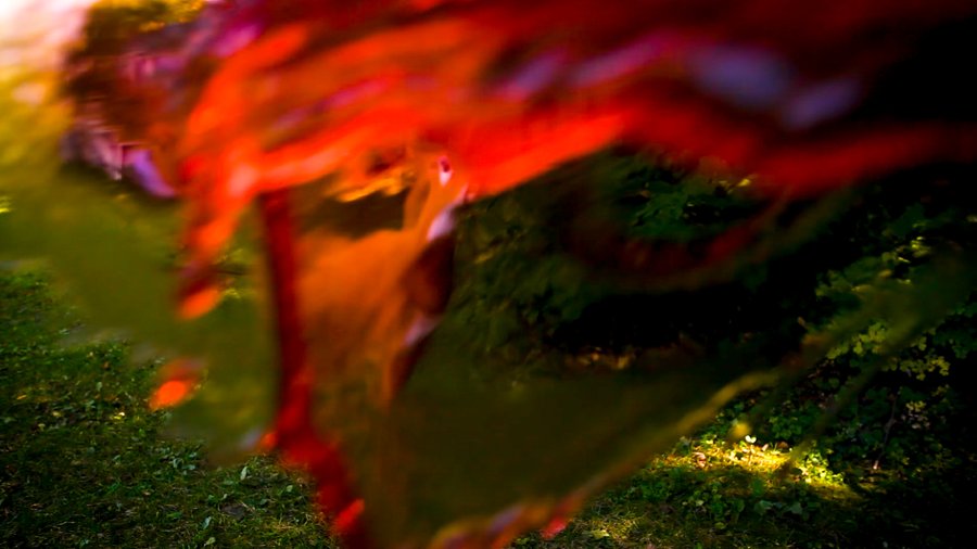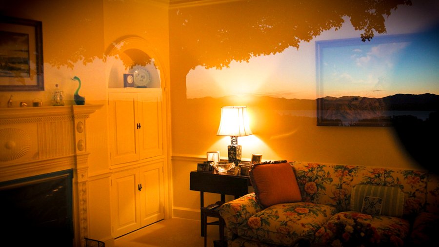In the living room of the old Main House, a camera is positioned looking through a sheet of glass. The day proceeds; the shadows move across the landscape. As evening arrives, the sheet of glass begins to reflect the interior. At twilight, we see half within and half without. At dusk, the outer world has vanished, and all we see is the inner room — a painting of two cheetahs in Africa, hung above a floral sofa.