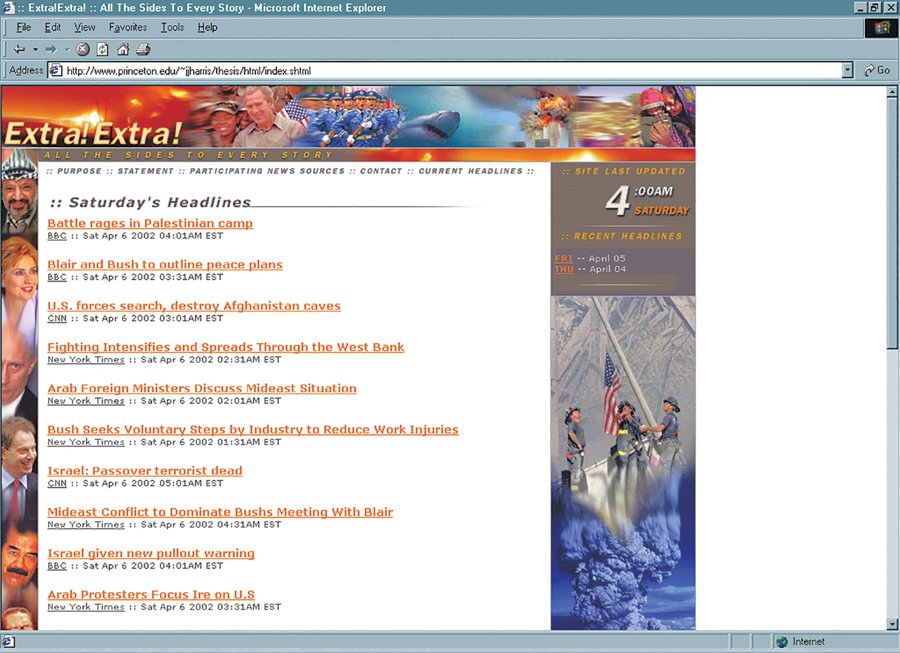 The project, named Extra Extra, preceded the creation of Google News by about six months — and sought to address media bias by offering users many alternative views. My thesis advisor was Brian Kernighan.