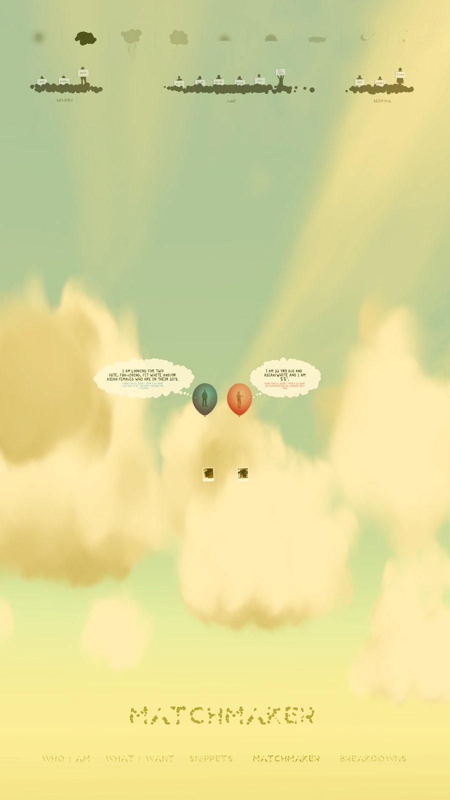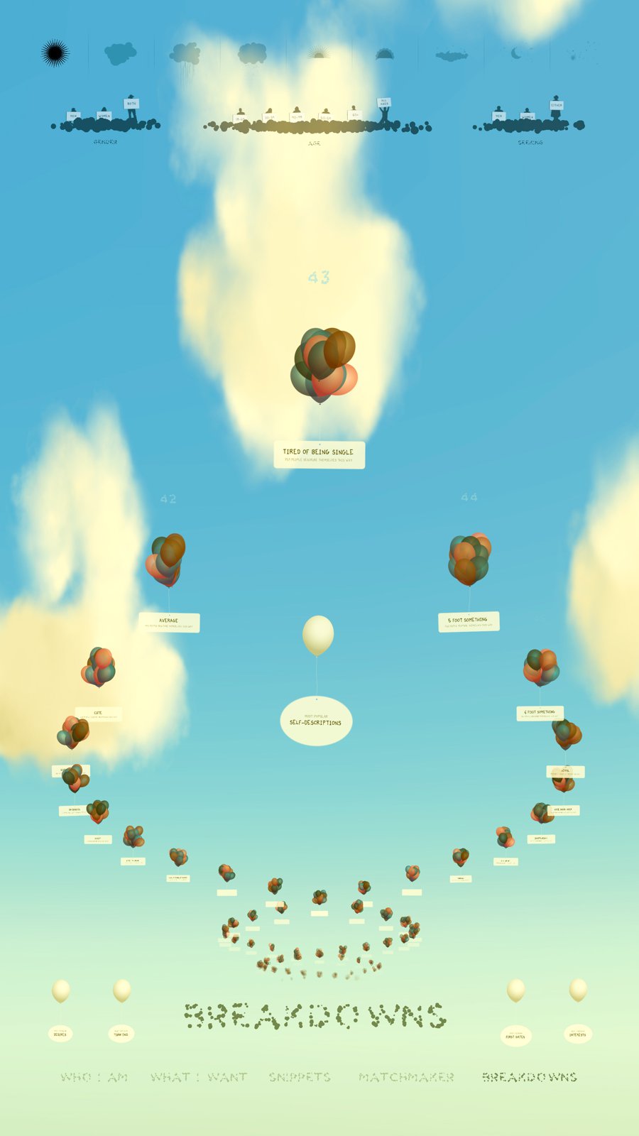 The data is presented as an interactive installation, displayed on a 56” high-resolution touch screen, hung vertically on a wall in a dark room. On screen is an interactive sky, whose weather (sunny, cloudy, rainy, snowy, etc.) can be controlled by the viewer. Through the sky float hundreds of blue (male) and pink (female) balloons, each representing a single dating profile. The brighter balloons are younger people; the darker balloons older. Trapped inside each balloon is one of over 500 video silhouettes, showing a solitary person, engaged in any number of activities (yoga, jumping jacks, nose-picking, air guitar, etc.). The viewer can touch any balloon to select it, causing its photo to dangle from a string and its sentence to appear in a thought bubble above. Touching any balloon a second time pops it. The balloons move through the sky along different paths and at different speeds, bumping up into one another, sometimes traveling together for a time, but only ever getting so close, as each silhouette is ultimately trapped inside its own balloon.