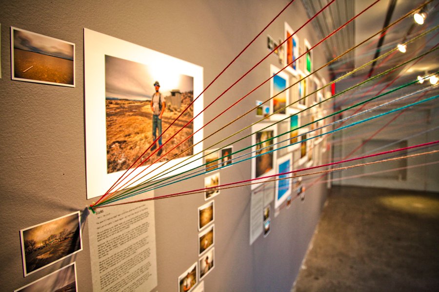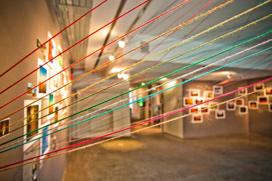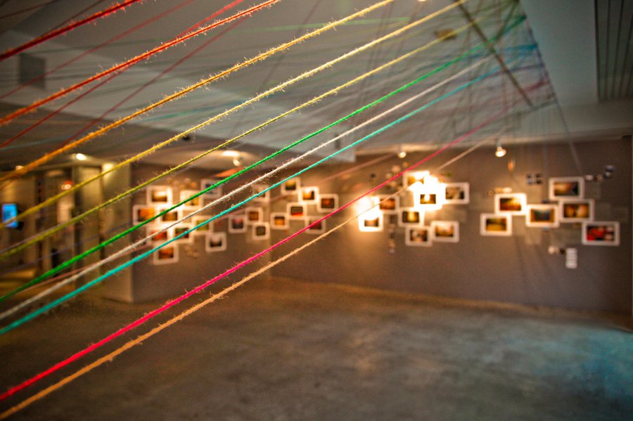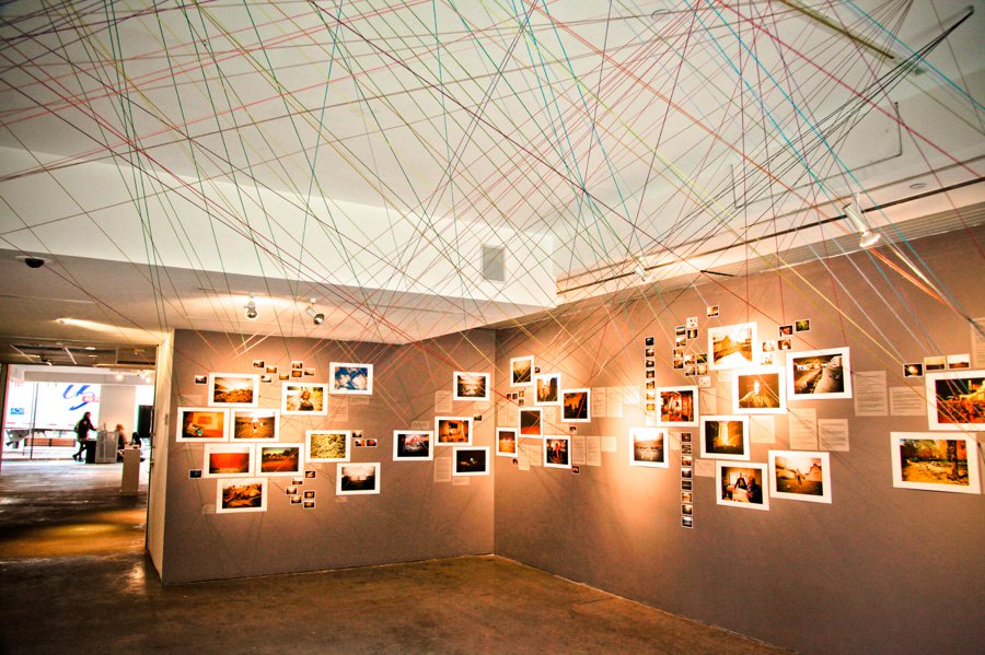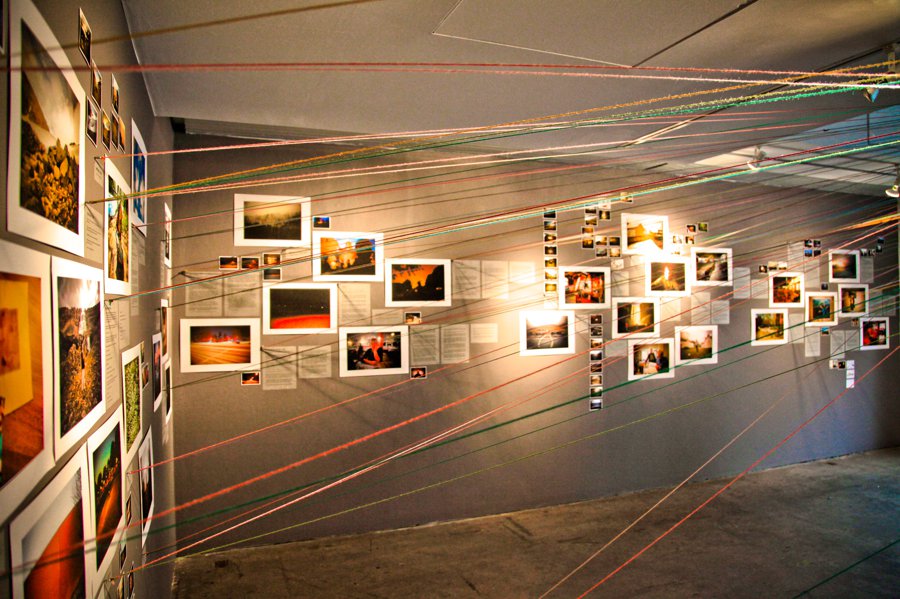 The installation presented hundreds of photographs from Today, physically connected through a network of color-coded strings, indicating common (but unspecified) themes. Accompanying each photograph was a personal story, printed by a computer program trained to imitate my handwriting.