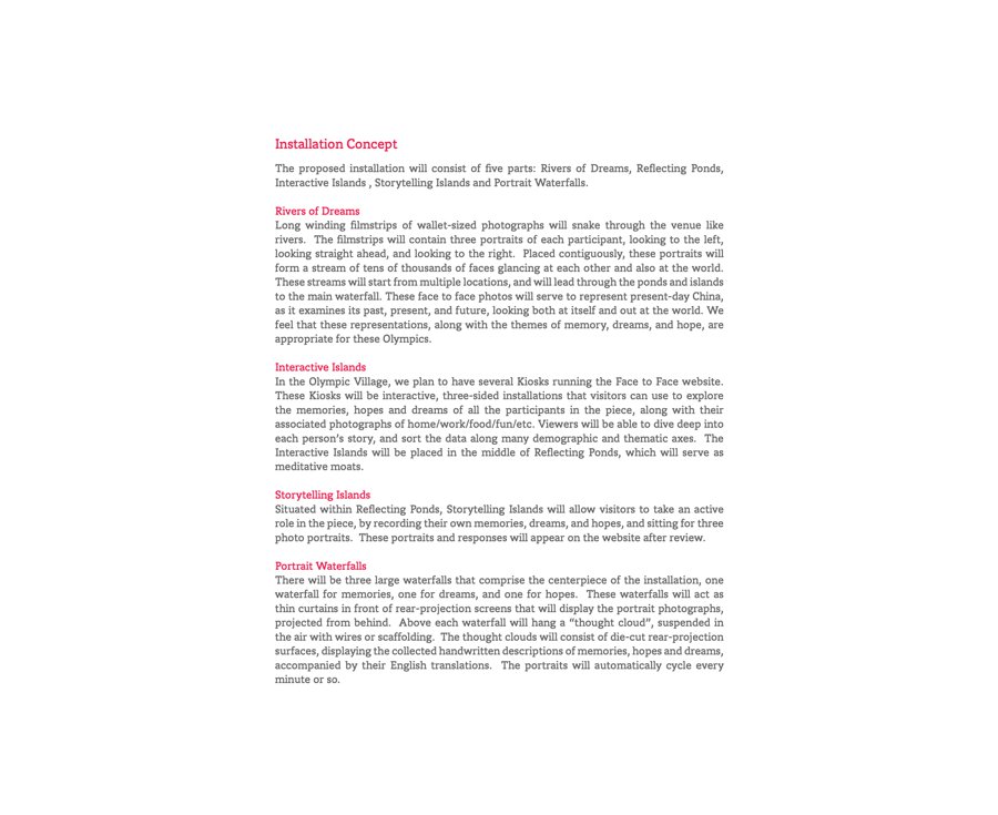 The project was to consist of a physical installation at the Olympic village in Beijing, along with an interactive website to share the collected stories with the rest of the world. The proposal was made in response to an invitation from Kodak, but due to the latter’s quickly shifting fortunes, it never became a reality.