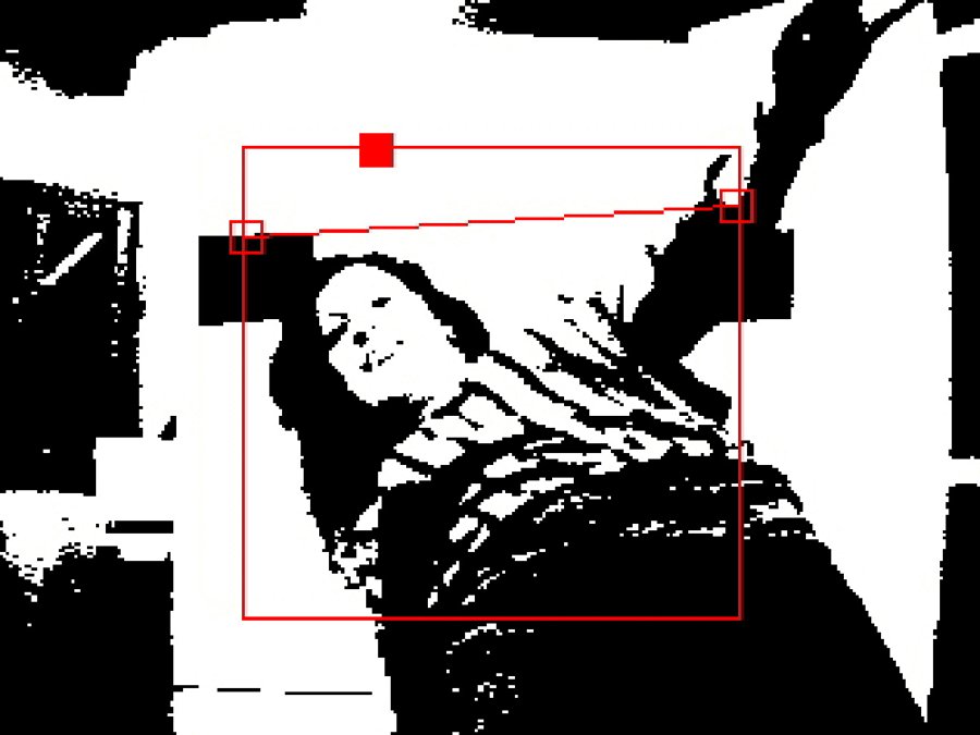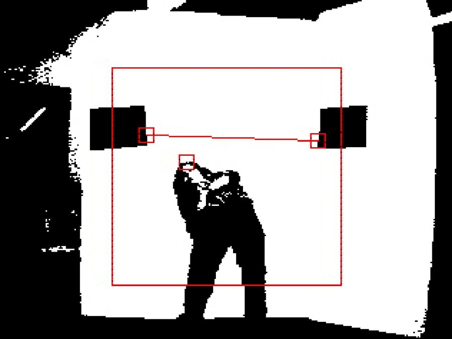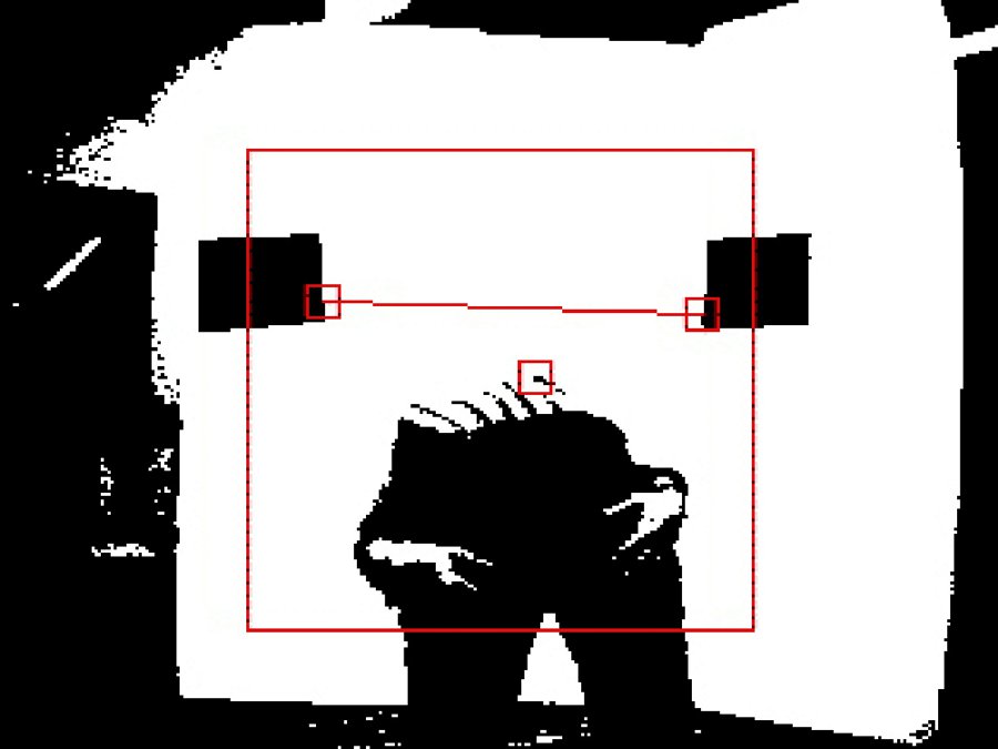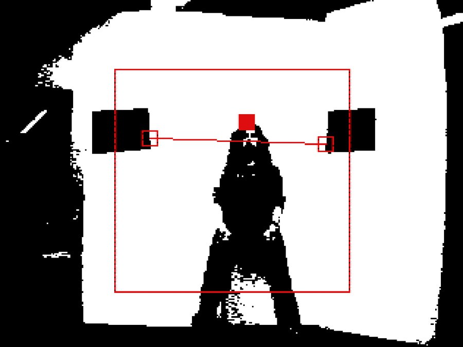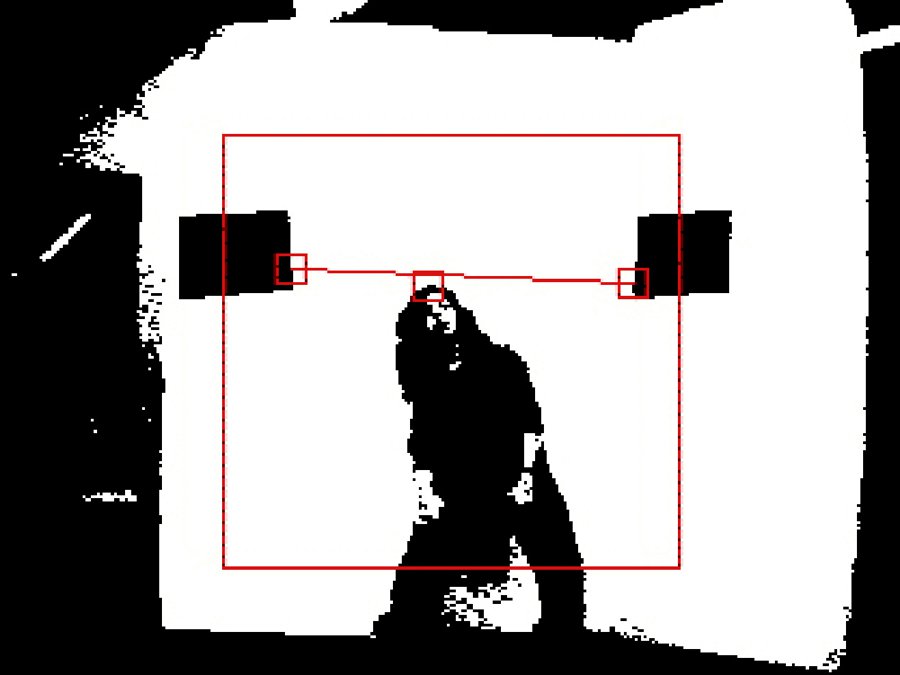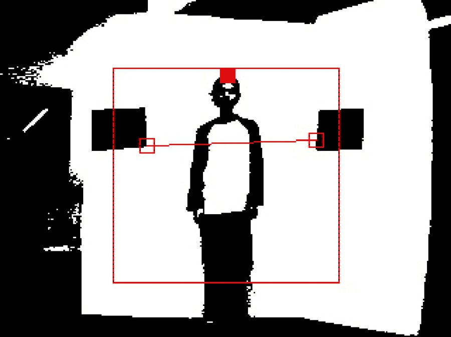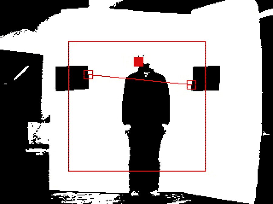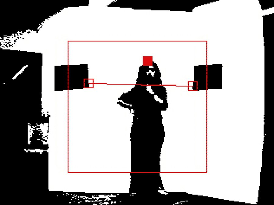 The camera tracks the image of a white background that’s set up in front of it, and then exaggerates the contrast between light and dark areas to deduce the difference between figure and ground. A threshold height is established by attaching two sheets of black paper to the white background — these locations are then used to form the endpoints of a red “limbo line.”