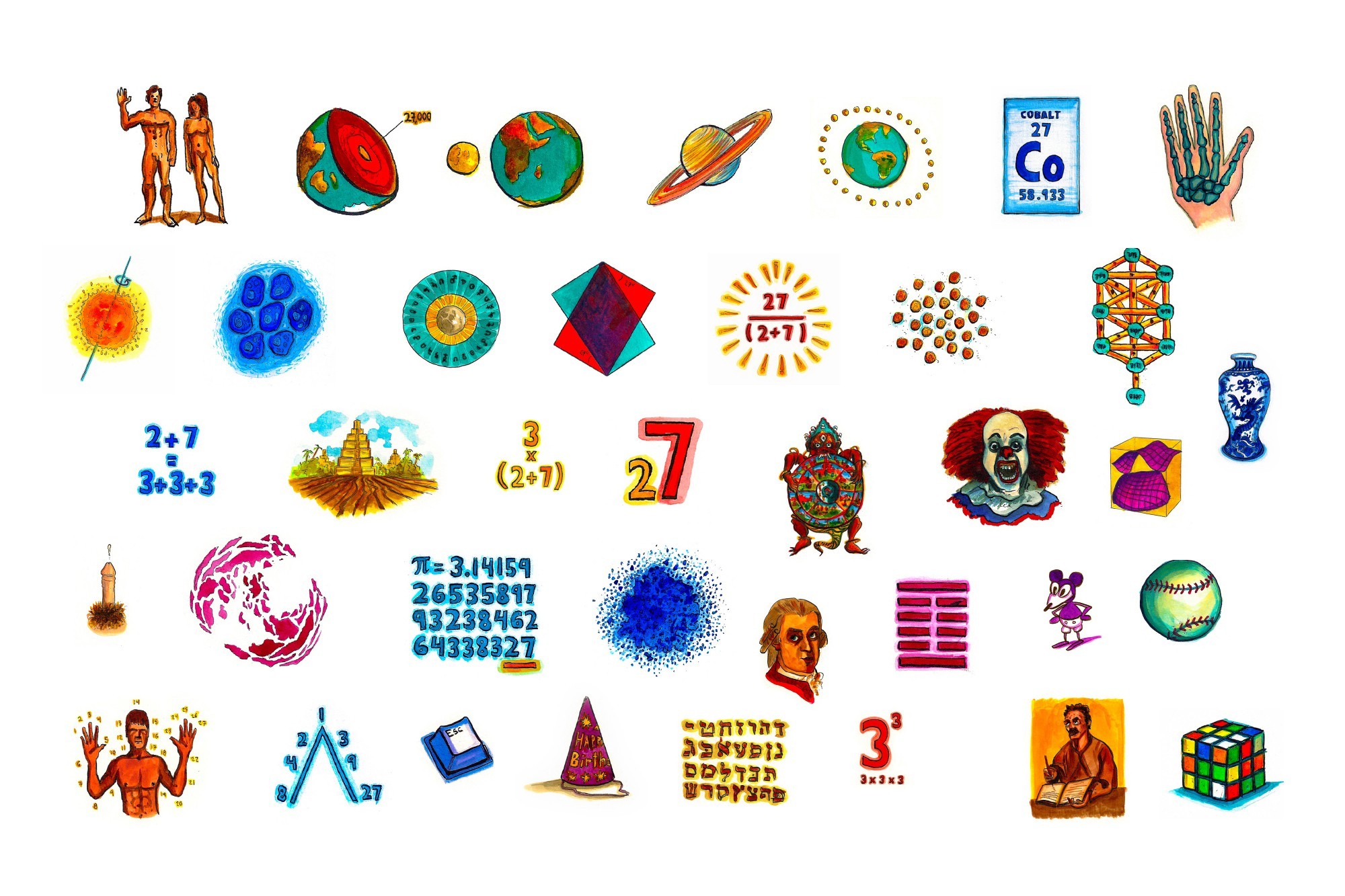 Just after college in 2003, I adopted the pen name ‘Number 27’ because of my fascination with its many interesting properties, mathematical and otherwise. For instance, every 27 days the sun rotates on its own axis, the moon orbits the earth, and the skin cells in our human bodies completely regenerate. The diameter of the moon is ~27% that of the earth, the human hand has 27 bones, and a typical human body has around 7 x 1027 atoms (that’s 7 followed by 27 zeros). I’ve illustrated some of its other mysterious qualities as well.