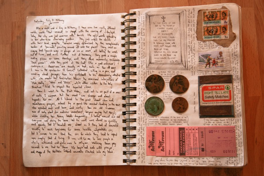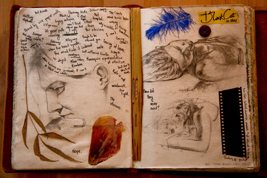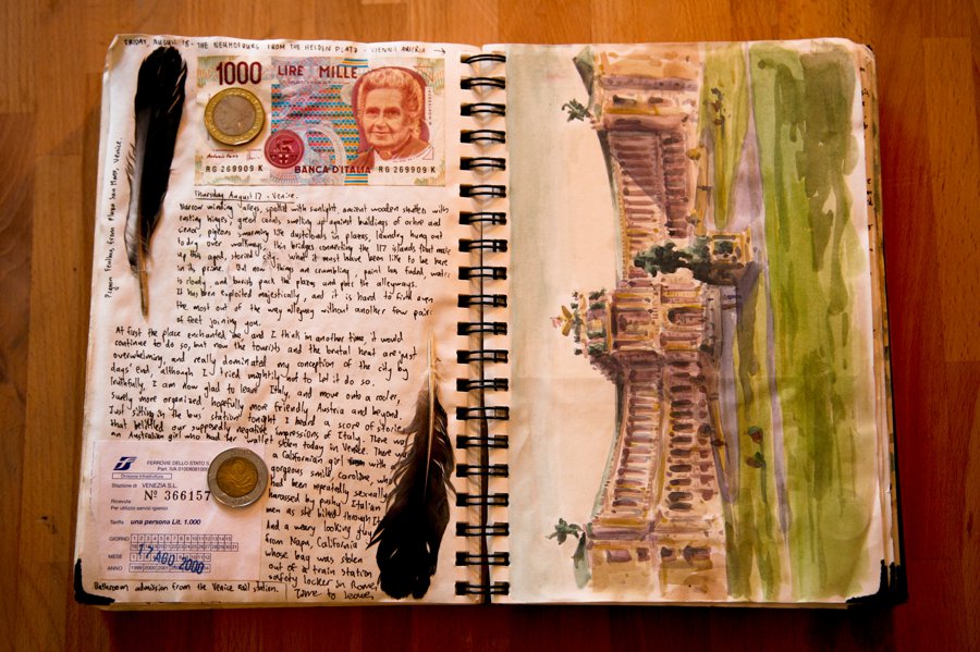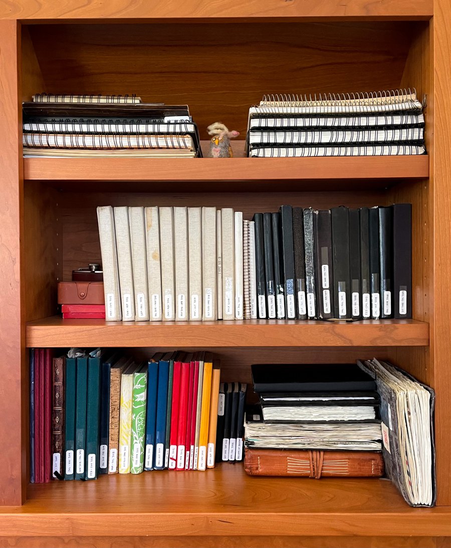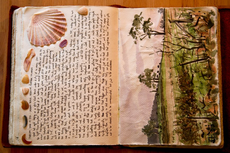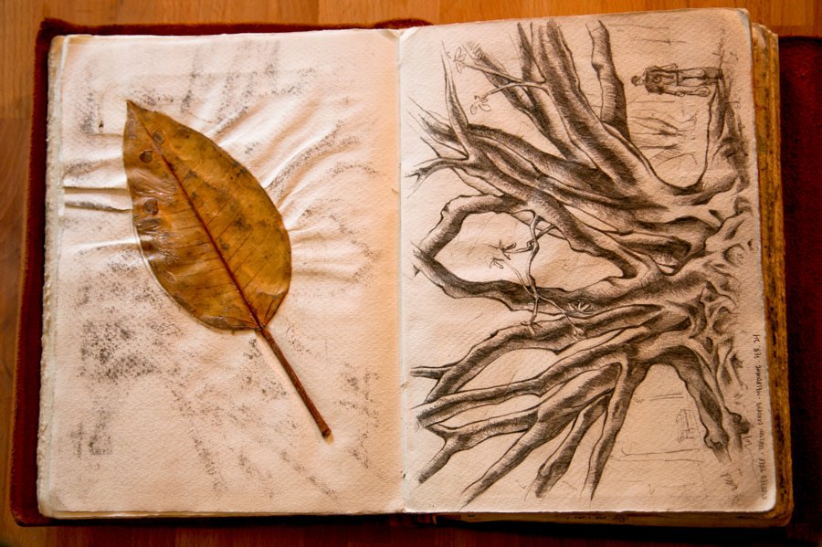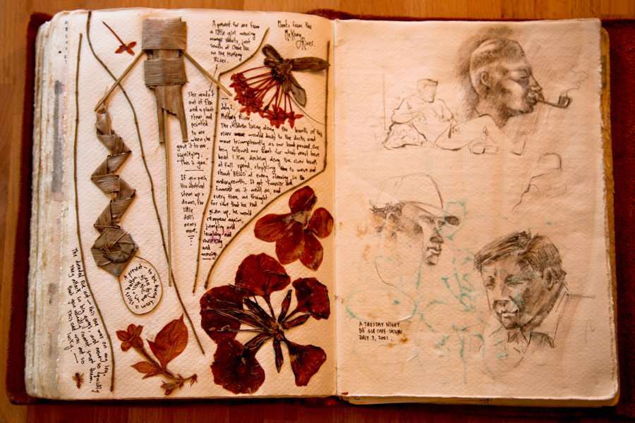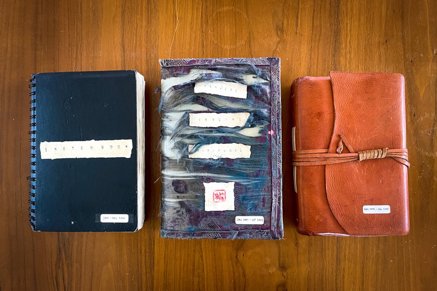 My sketchbooks — filled with dead insects, pasted plants, watercolor paintings, drawings, writings, coins, ticket stubs, and other assorted ephemera.