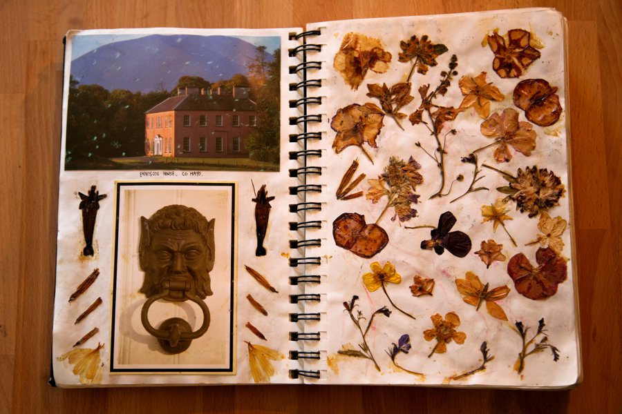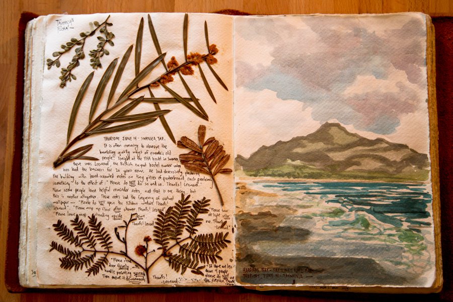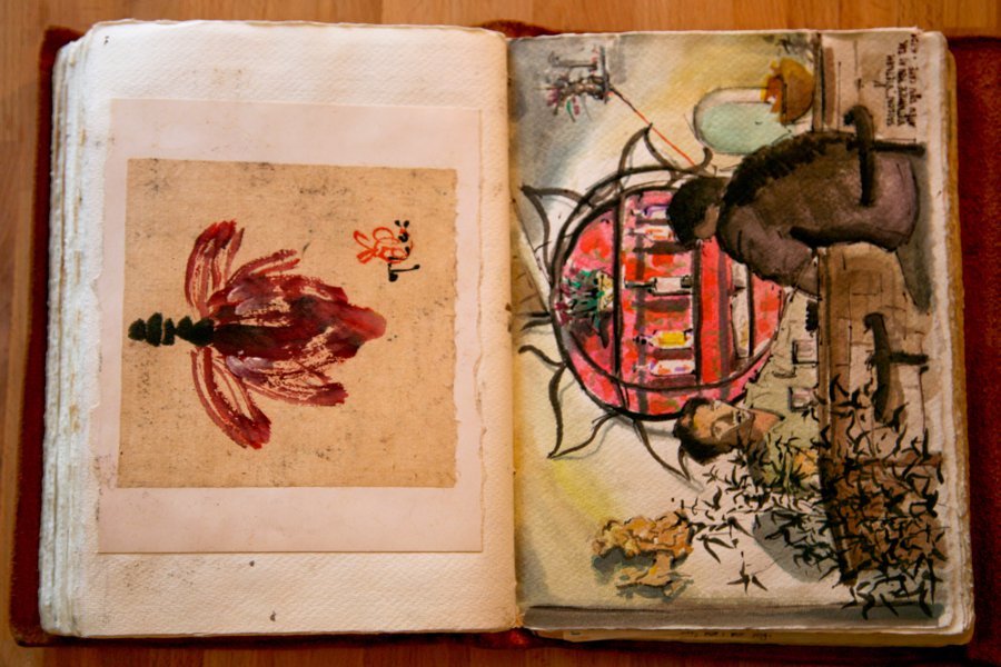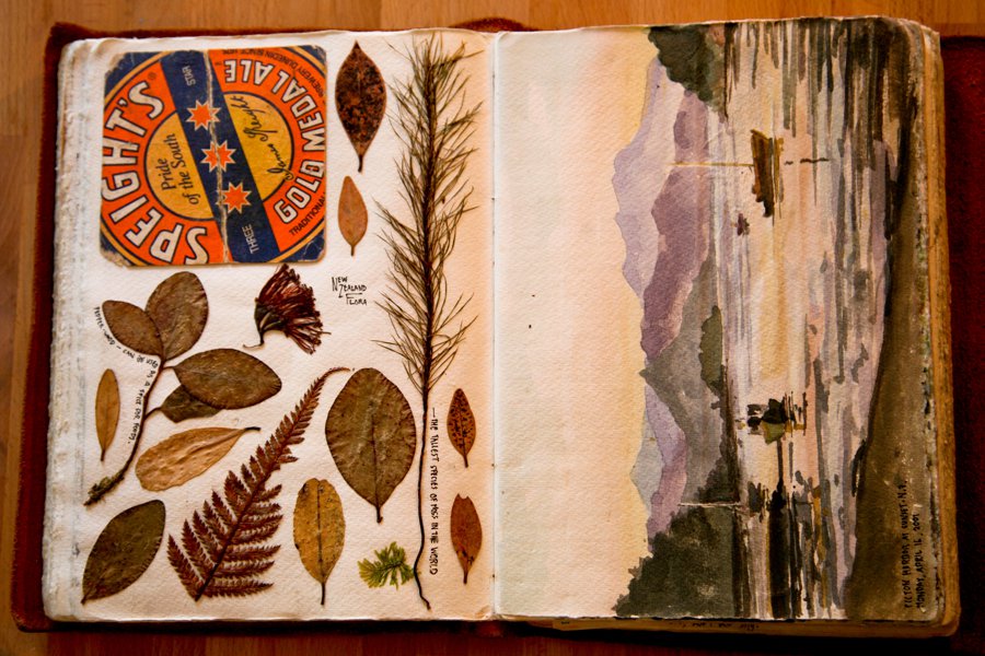 A set of travel journals filled with watercolor paintings, plants, insects, and other ephemera