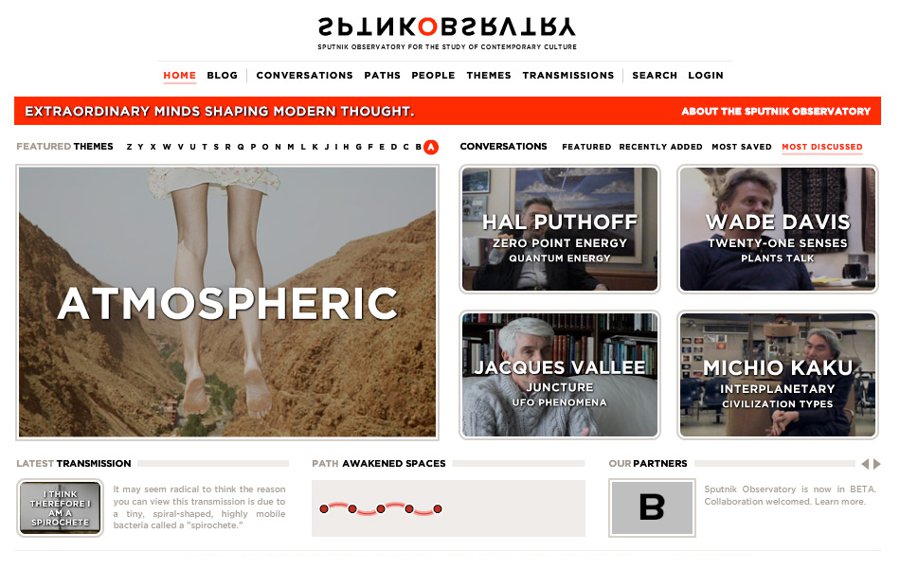 The central premise of Sputnik is that all ideas are interconnected, and that topics and ideas that may seem fringe and even heretical to the mainstream world are in fact being investigated by leading thinkers working in fields as diverse as quantum physics, mathematics, neuroscience, biology, economics, architecture, digital art, video games, computer science and music. Sputnik is dedicated to bringing these ideas from the fringes of thought out into the limelight, so that the world can begin to understand them.