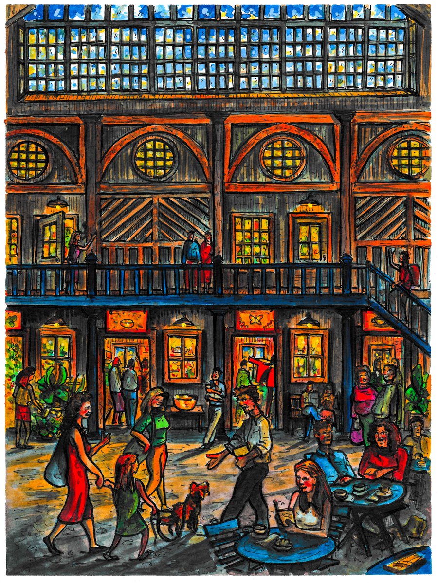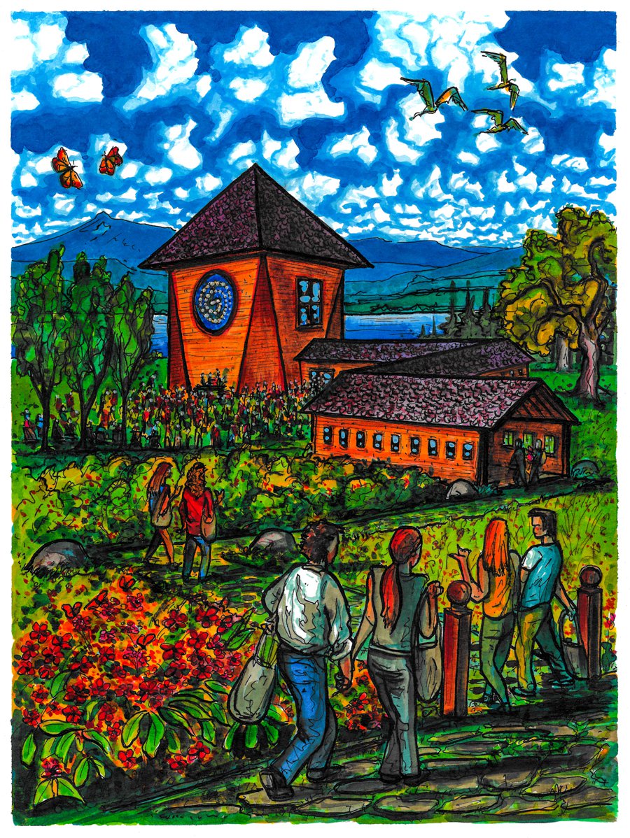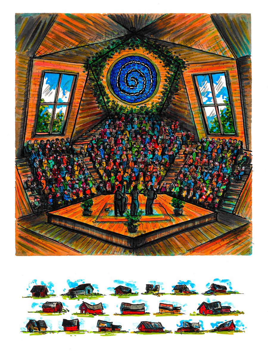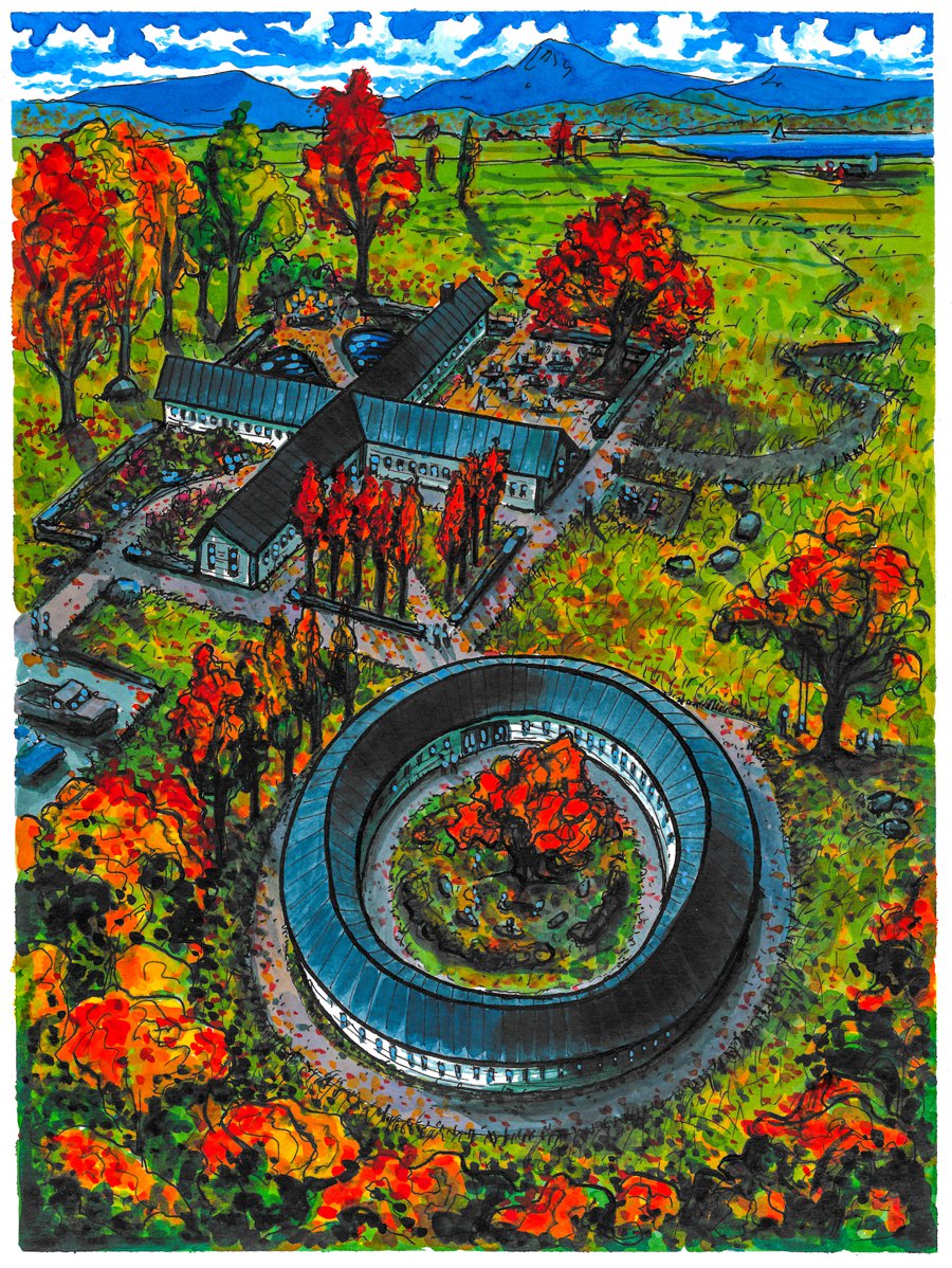 The proposal includes a fellowship program exploring the synthesis of human culture and the natural world; a collection of products using natural materials in innovative ways; a series of “observatories” made in collaboration with contemporary artists and installed in the physical landscape; an incubator program for young companies working in some way with “nature”; a gathering hall made from the salvaged remains of seventeen crumbling Vermont barns; a restaurant in the hayloft of an old gambrel-roofed building; a ferry service connecting with the Burlington waterfront so that visiting travelers can arrive here by boat; a design hotel geared at art aficionados; an annual festival for creative practitioners from all over the world; a wellness center exploring alternative healing techniques; a community marketplace in the old Shelburne Farms Breeding Barn; a walkable village in the living landscape.