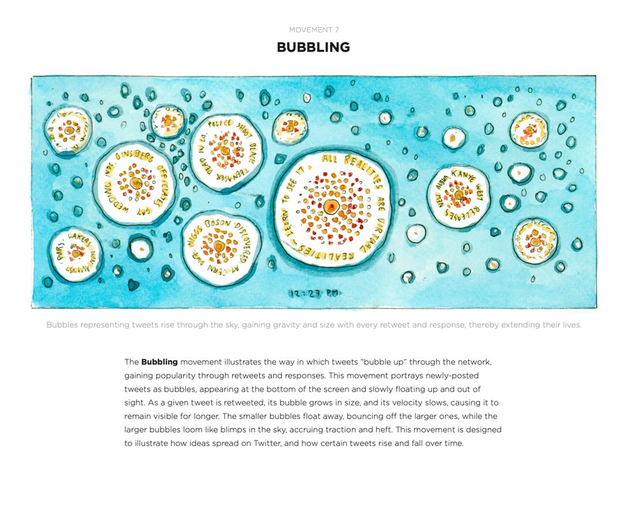 - Bubbling — particle clusters coalesce organically, showing the way in which Tweets “bubble up” through the network via likes and retweets.