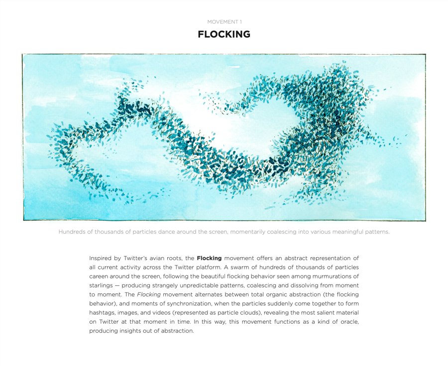 - Flocking — vast particle clouds swarm around the screen, periodically coalescing into hashtags and other objects of focused attention.