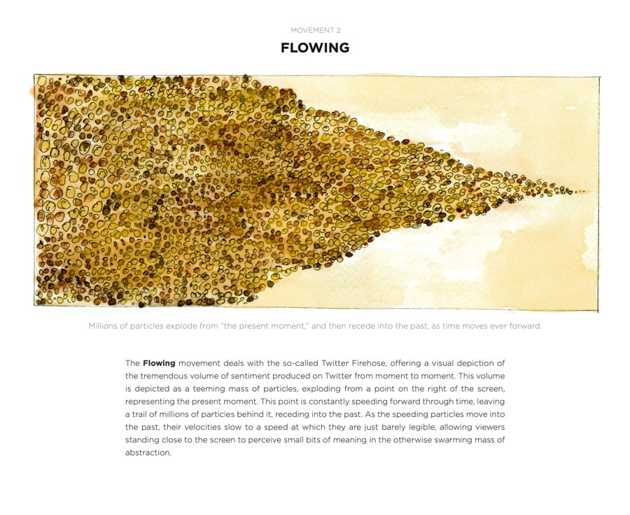 - Flowing — the stream of recent Tweets, known internally as “the firehose,” is visualized as an exploding particle fountain.