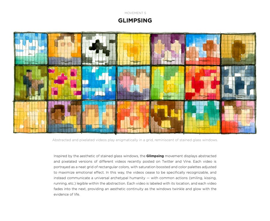- Glimpsing — live videos are abstracted into colorful pixelated squares, reminiscent of stained glass windows in a cathedral.