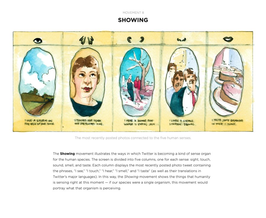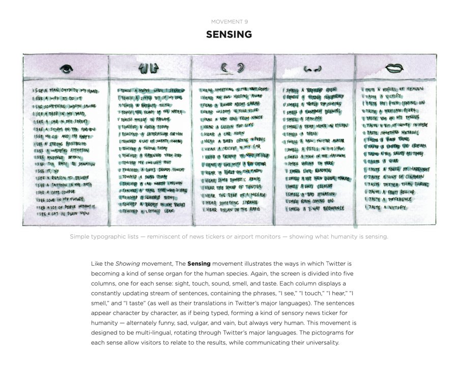 Twitter Sensations was a proposed project exploring human sensory capacities as expressed through Twitter — intended as a permanent installation for the lobby of their San Francisco headquarters, with companion pieces online.