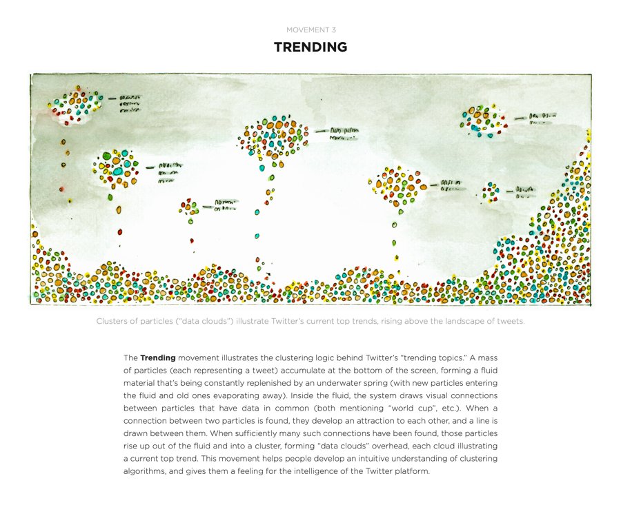 - Trending — clusters of particles rise to form clouds, revealing the machinations of Twitter’s “trending topics” algorithm.