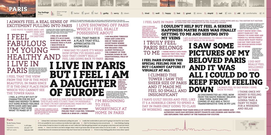 The 288-page book contains photographs from over 1,000 individual bloggers, thousands of statistical computations, hundreds of infographics, dozens of back stories and in-depth profiles, and countless insights into the extraordinary lives of ordinary people, as deduced through We Feel Fine.